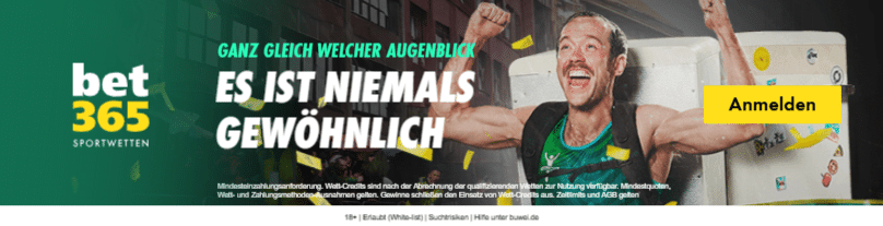 Nur für neue Kunden. Bis zu €100 in Wett-Credits. Melden Sie sich an, zahlen Sie €5 oder mehr auf Ihr bet365-Konto ein und wir geben Ihnen die entsprechende qualifizierende Einzahlung in Wett-Credits, wenn Sie qualifizierende Wetten im gleichen Wert platzieren und diese abgerechnet werden. Mindestquoten, Wett- und Zahlungsmethoden-Ausnahmen gelten. Gewinne schließen den Einsatz von Wett-Credits aus. Es gelten die AGB, Zeitlimits und Ausnahmen.
